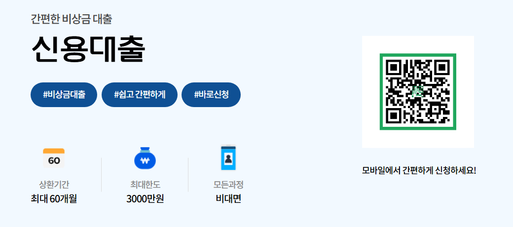 이 상품은 온라인을 통해 간편하게 신청할 수 있는 비상금 대출로, 신용대출과 부동산 담보대출을 포함합니다. 모든 과정이 비대면으로 진행되며, 최대 3,000만 원까지 대출이 가능합니다.