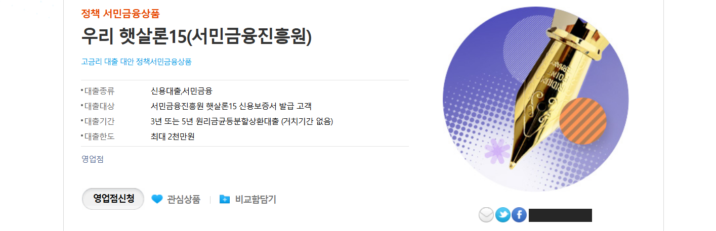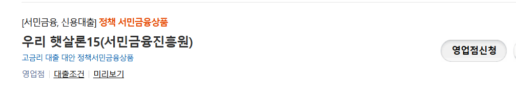 - 우리은행의 상품설명서 공시 및 영업점 신청 화면에서 “우리 햇살론15(서민금융진흥원)” 항목 통해 접수 가능함.
