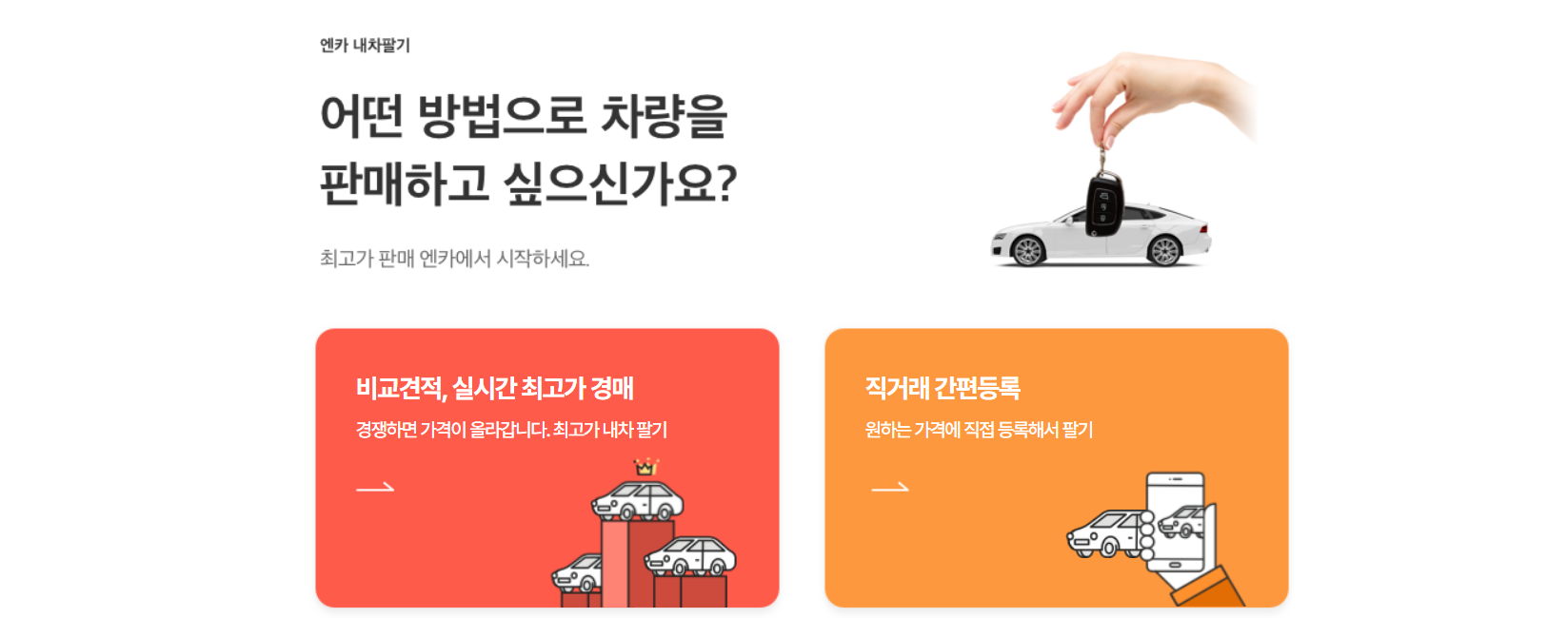 - 비교견적 또는 직거래 등록: 여러 딜러로부터 견적을 받는 ‘비교견적’ 방식 또는 개인 간 직접거래 형태의 ‘직거래 간편등록’ 방식을 선택하실 수 있습니다.