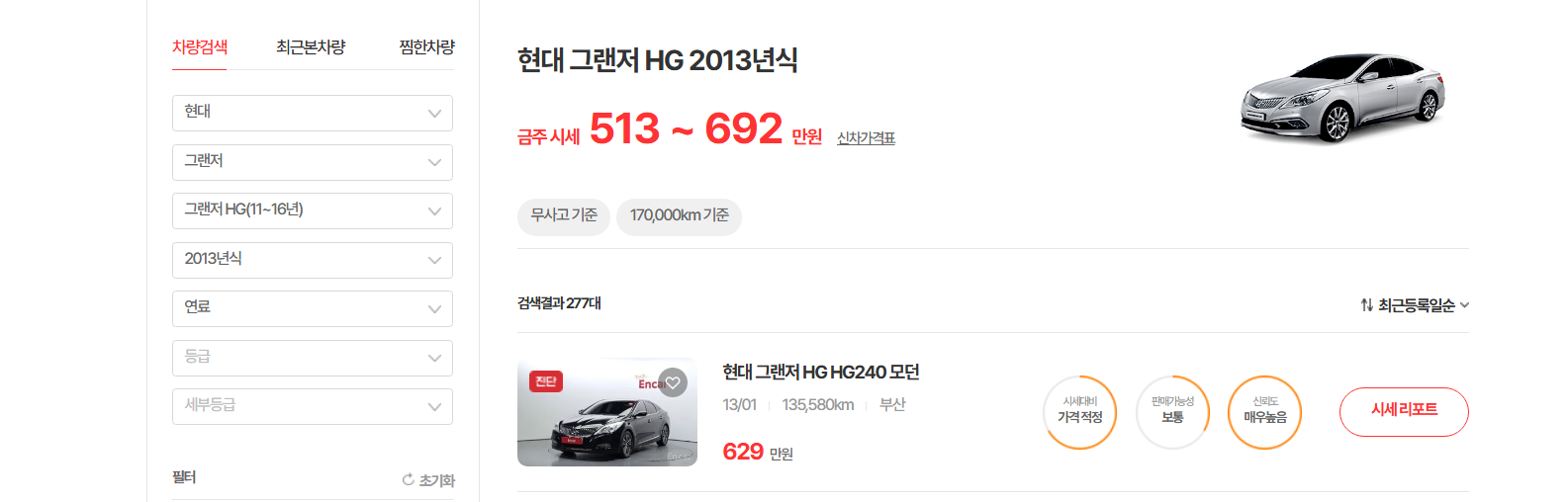 - 상세 정보 확인: 검색된 매물에서 사진, 옵션, 보험이력, 성능점검표 등을 확인하시면 됩니다.