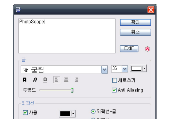 폰트 변경, 크기조절, 색상 변경, 윤곽선 효과 설정이 가능합니다.