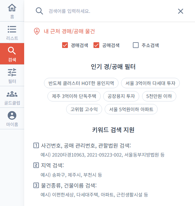 - 공매·경매 통합 검색: 법원경매와 온비드 공매물건까지 한 번에 검색