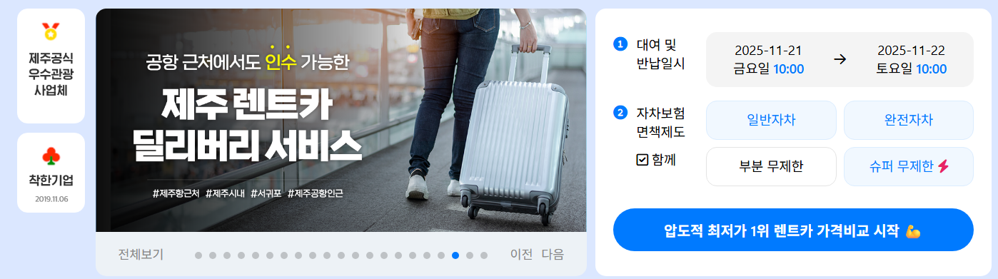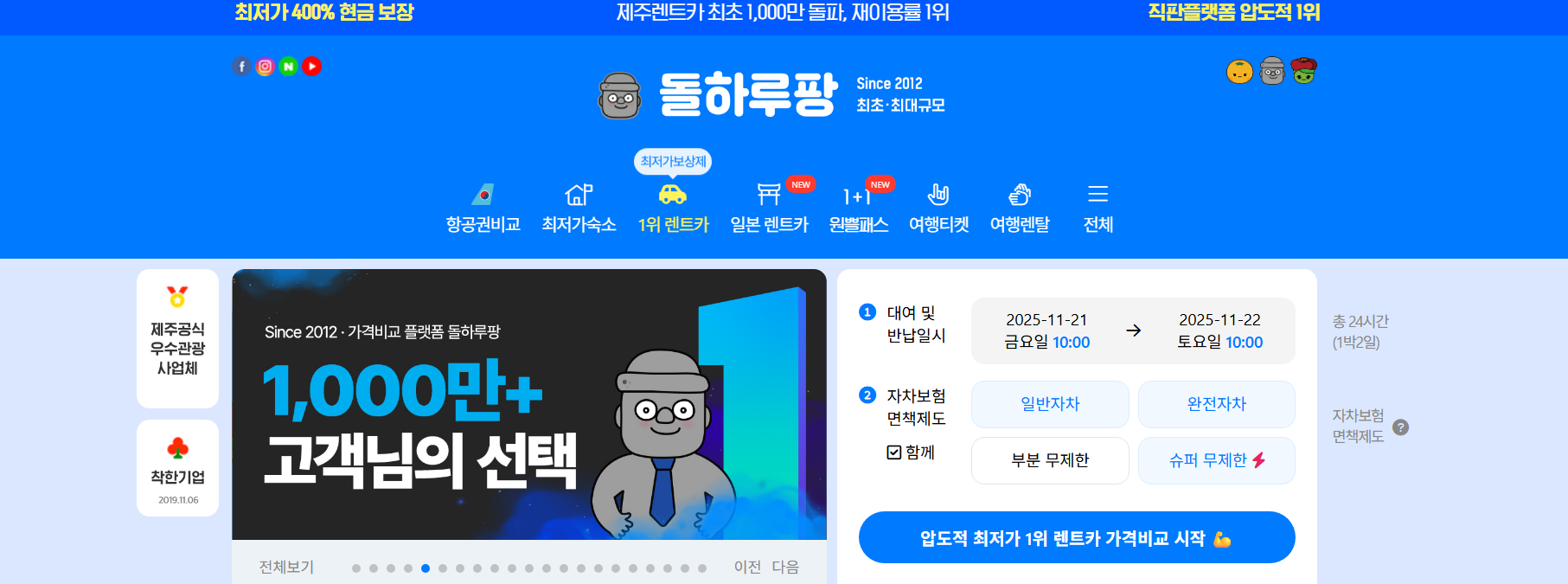 이럴 때 돌하루팡과 같은 렌트카 비교 플랫폼을 활용하면 실시간으로 여러 제주 렌터카 업체의 요금을 한눈에 비교하고, 자신에게 맞는 조건을 선택할 수 있어 보다 편리하고 안전하게 여행을 준비할 수 있습니다.