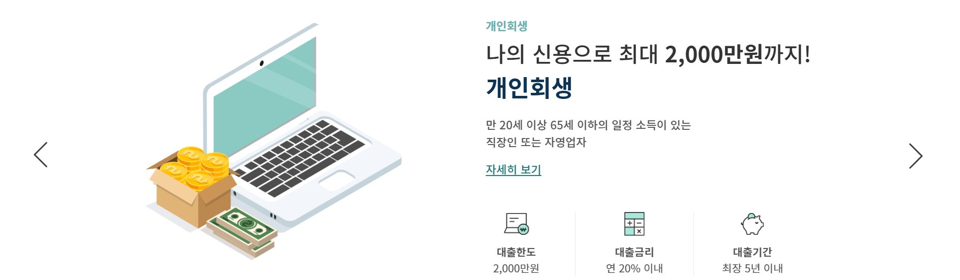 - “만 20세 이상 65세 이하의 개인회생인가결정, 파산면책 결정자로 소득증빙 가능한 사람들을 대상으로 최대 2,000만 원까지 대출을 제공”
